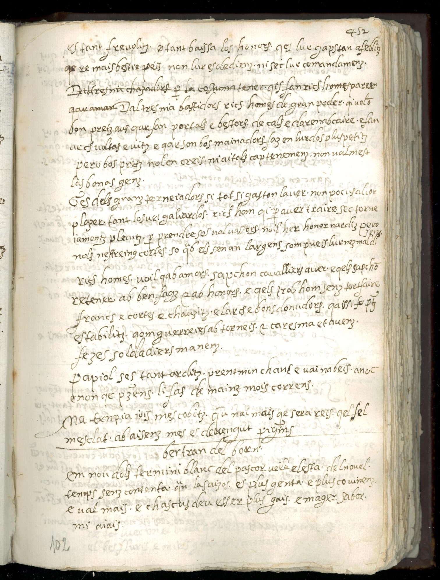 [B]En auez entenduz los mals qe b(er)tra(n)s de born recordet qel reis daragon auia faich de lui e dautrui. Et acap duna gran sazo(n) qel nac apres dautres mals q(e)l auia faich. si los uol retraire en un autre sirue(n)tes. E fo dich an b(er)tran qun caualier auia inaragon qui auia nom nespagnol(s) (et) auia un bon castel molt fort. qui auia nom castellot. (et) era p(ro)prietatz denespag(no)l. (et) era in la forteresa de sarazis. don el fazia gran guerra als sarazis. el reis si ente(n)dia molt enaqel castel. E uenc un dia enaqe- lla encontrada.e enespagnols sil uenc enco(n)tra p(er) s(er)uir lo (et)p(er) enuidarlo al seu ca- stel. (et) menetelo dinz lo castel. lui e tota sa gen. El reis qan fo dintre lo fez prendre e menar de foras. e tolcli lo castel. E fo uer tatz qeqan lo reis uenc al s(er)uizi del rei he(n) ric. lo coms de tolosa sil desconfis engua scogna. etolc li ben cinqanta caualiers. El reis henrics li det tot lauer qill cauali er de uian pagar p(er) la prexon. Et el no pa get lauer als caualiers. anz len porteten aragon. eill caualier eissiren de preson e pageren lauer. E fo uertatz qus ioglars q(i) auia nom artusetz li prestet dozenz ma |