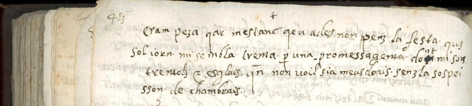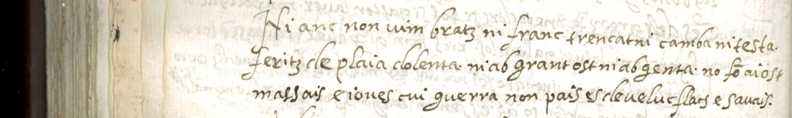 men lui et un son conpai(n)gnon. Et artuset (et) us sos conpai(n)gs accusseron un iuzieu don li iuzieu aneron al rei epregueron lo quel enfezes uen- deta eque lor des artus el conpai(n)gnon p(er) aucire. equill li darian. cc. marabotis. el reis los lor do- net amdos epres los. cc. marabotis.eill iuzieu les feiron ardre lo iorn de la natiuitat de crist si comdis Guillems de berguedam en un sieu s(ir)- uentes dizen en el mal del rei. Efetz una mes preison. Don hom nol deu razonar. Quel iorn de la naision. fetz dos crestias brusar. Artus ab autre son par. Eno(n) degra aici iutgar amort ni apassion. Dos p(er) un iuzieu fellon. Don us autre que auia nom peire ioglar li p(re)stet deniers eca- uaus. et aquel peire ioglars si auia grans ma- ls ditz de la ueilla reina denglaterra. la quals tenia font ebrau. que es una abadia onse rendon to- tas las ueillas ricas. et ella lo fetz ausire p(er) parau- la del rei darragon. etotz aquestz laich faich re menbret enbertrans de born al rei darragon en aquest sirue(n)tes que dis. Quant uei p(er) uergiers despleiar. los cendaus grocs indis. (et) cetera. |