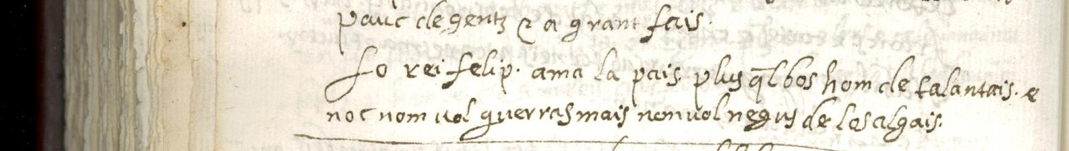 Et ac dich al rei phelip com p(er)dia de cincs ducatz los tres. e degiort la renda el p(er)catz e com caersi(n)s remania en gerra (et) en barata.e la terra dengolmesa.e con frances e borgognon auion canbiada honor p(er) cobezesa.e com lo reis phelips a uia anat plaideiar sobre la riba de laiga. e comel non auia uolguda la paz qan era de sarmatz. e tan tost co(n) fo armatz el p(er)det lau(er)tut lardime(n) ela forsa. eqel mal sem blaua lo conthenricloncle den raols de |