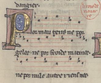 | Por mau tens ne por gelee. ne por froide matinee. ne por nule autre riens nee. ne partirai ma pensee dam(or)s que iai que trop lai amee de cuer uerai |