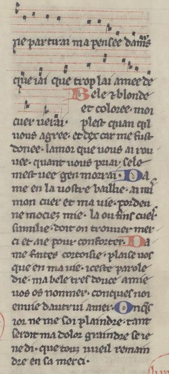 | Bele (et) blonde et coloree. moi plest quan qil uous agree. et dex car me fust donee. lamor que uous ai rou uee. quant uous priai. sele mest uee gen morrai. |